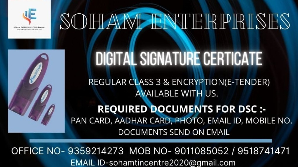 Looking to get a secure and legally valid Digital Signature Certificate (DSC) in Pune? Soham Enterprises, based in Bhosari, Pune, offers hassle-free and quick DSC services for individuals, professionals, companies, and government-related filings.